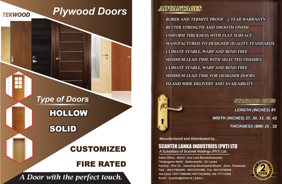 To serve the industry with quality product range, we are engaged in presenting a wide range of Plywood Doors. Our range is designed by our team of experts who are following entire quality parameters of the market. Plywood Doors is beautifully carved with the use of high quality tools. Various design options are available with us in our offered range. High quality plywood doors for domestic and industrial usage , manufactured to the perfect technical specs . We supply to the international and local markets . MANUFACTURED AND DISTRIBUTED BY SCANTEK LANKA INDUSTRIES PVT LTD 654/31 , Muwanhelawatte Road , Thalangama , Battaramulla, Sri Lanka 0771896299 / 0777712309 / 0763435324